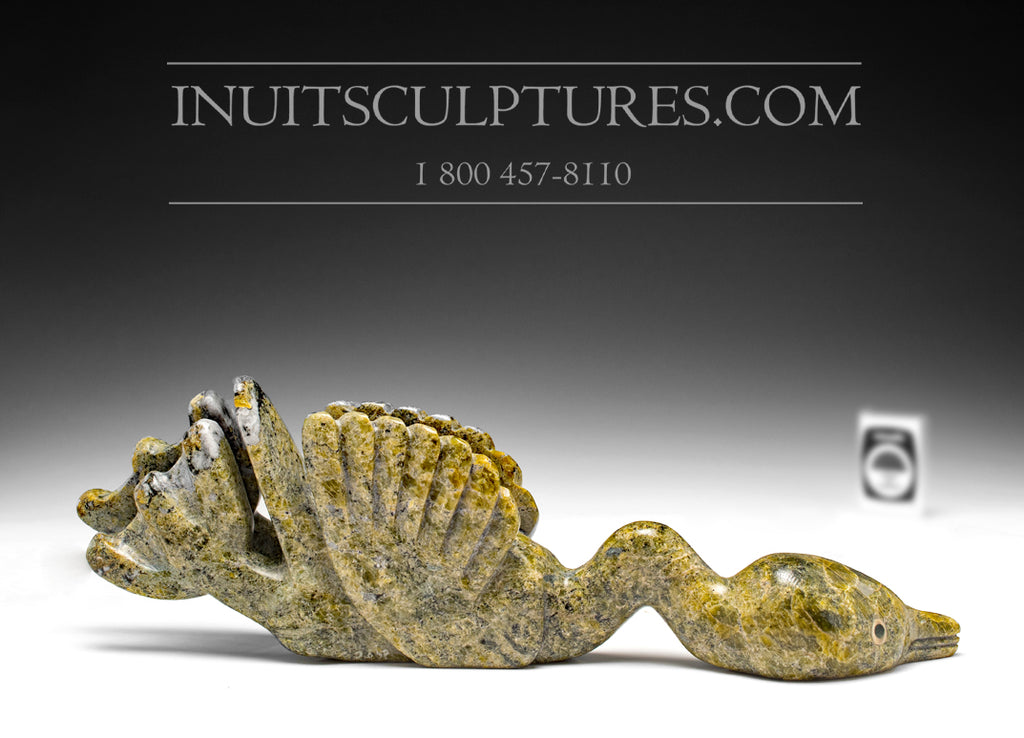 This is a gorgeous lying goose. One of our favorites by Toonoo. The beautiful stone, movement and innocence send positive waves throughout our gallery.