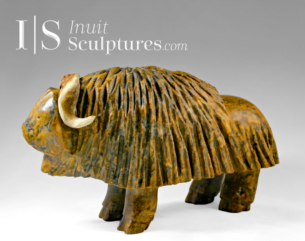 This pensive Louie Uttaq Muskox is carved using Mudstone*. Although the camera lights gives the stone a mustard gold look, the actual colour is more of a warm medium tan.