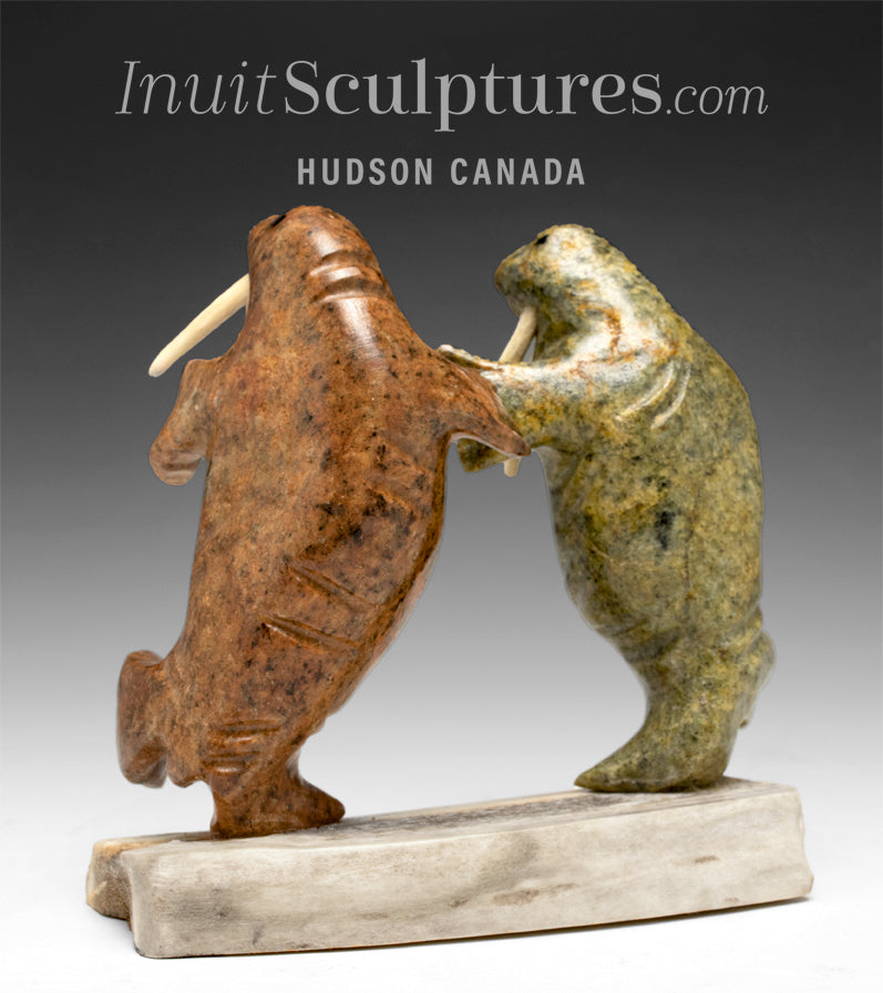 One walrus a soothing yellow green, the other in a deep caramel colour.