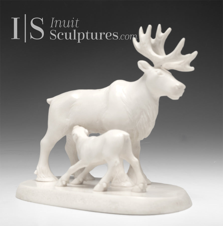 This magnificent caribou bone carving of a Mother Caribou nursing her calf is a subject I cannot recall seeing in the Inuit art community.