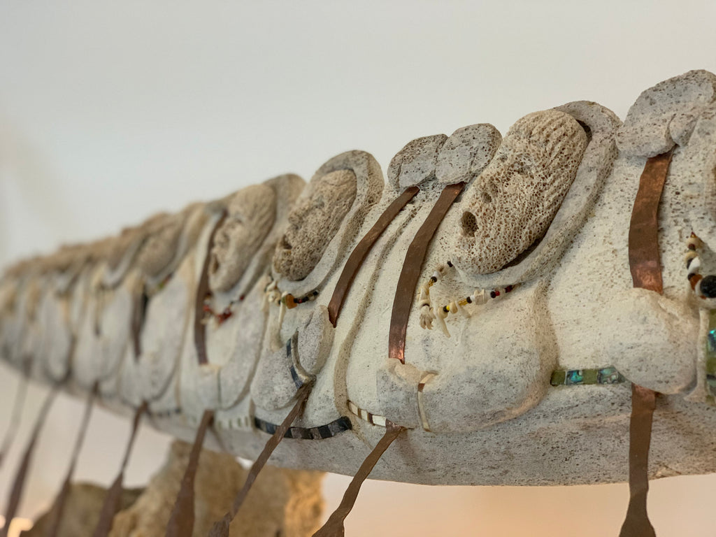 Bob Kussy and Goota Ashoona have carved an extraordinarily exquisite sculpture illustrating the voyage of eleven Inuit men in their Umiak on the Arctic Ocean.