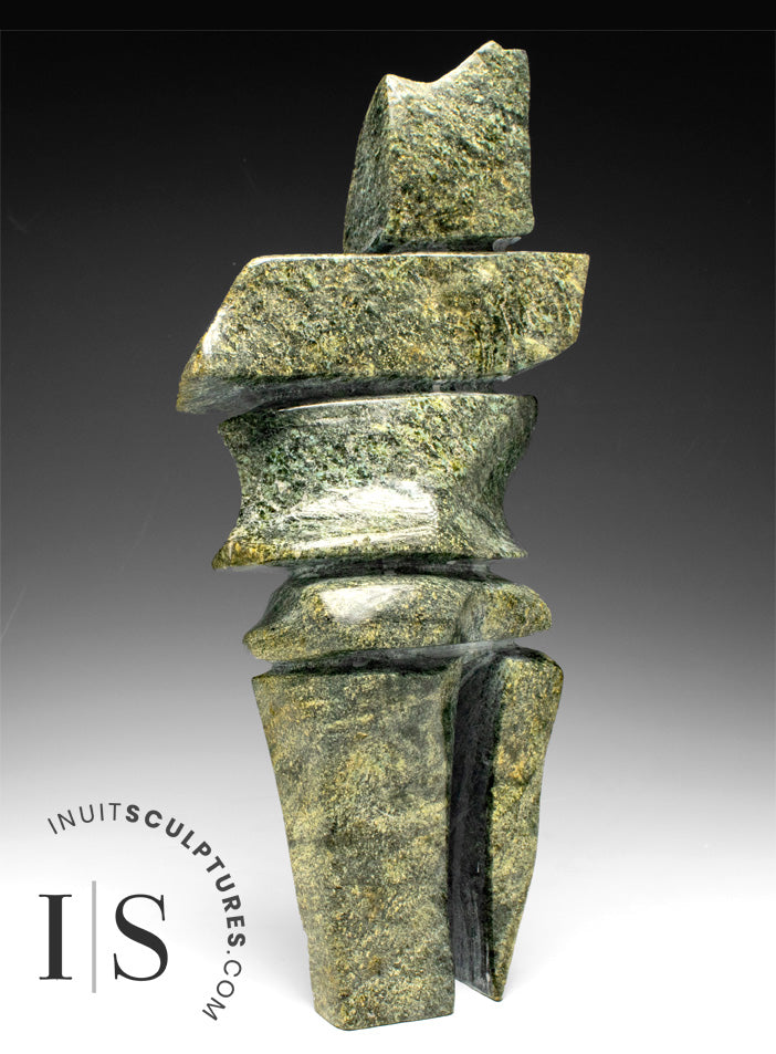 The beauty of this piece is first, the pale green gray stone and second the large square shoulders.  Did you notice this Inukshuk has no "arms"?