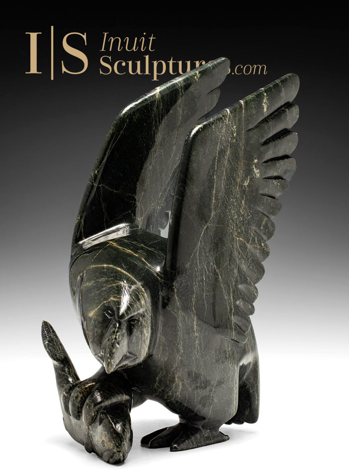 This Killiktee sculpture is a black hawk who has successfully landed his fish dinner (any chips)?