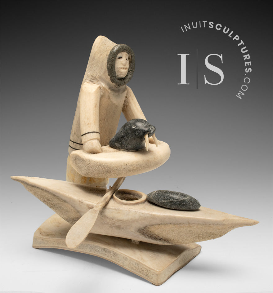 NEW MUKLUKS FOR MAMA is a beautifully carved and designed depiction of an Inuk Hunter with his Kayak and his catch.