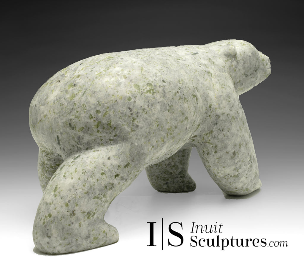 Kolola has sculpted Kody from a rare creamy white stone gently speckled with moss green.