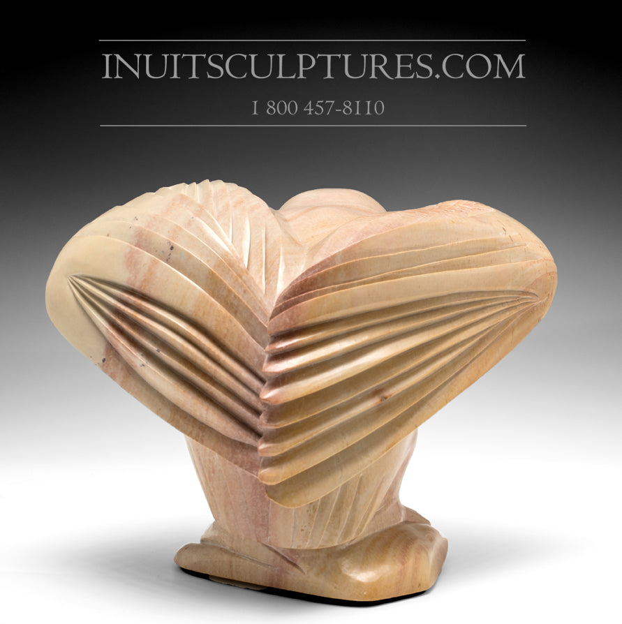 This monumental work is possibly unique in Goota Ashoona and Bob Kussy 's oevre in that it strays from more medium sized pieces. They have created an impressive body of sculptures depicting human figures and other animals as well, but it is their affinity with the owl that has captured the imagination of collectors.