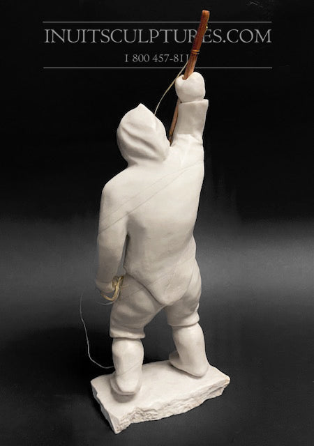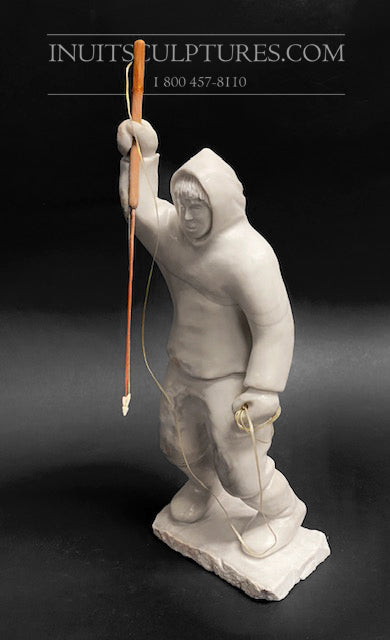 Master carver Bobby Anavilok has crafted this gorgeous rendition of a hunter with poise and originality. I have never had such an unusual carving from Bobby. This brave comrade draws back his harpoon, waiting for the exact moment to strike his prey. The proportions of the body is perfect. The arm muscles are taut and lean. I love the crisp lines of the  but it is his eyes that hunter impart strength and intensity to the piece.