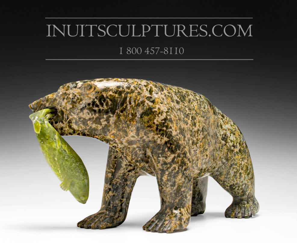 “Walking bear with fish” is an authentic Inuit carving which is signed on the bottom by Lyta Josephie.