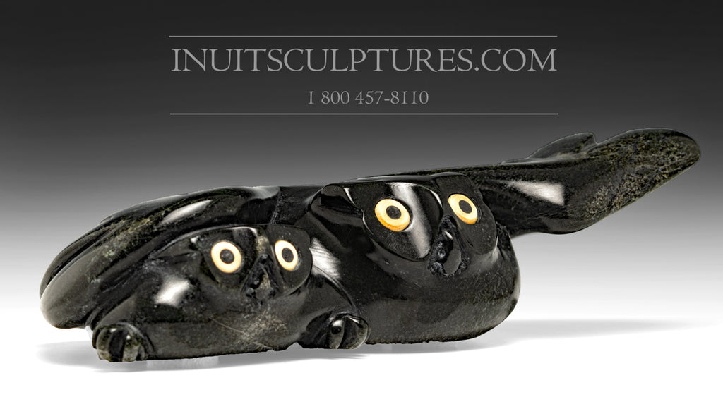 The eyes made from caribou antler blend exquisitely with the dark serpentine stone. The carving is polished to a mirror shine with beautiful proportions and lines throughout.