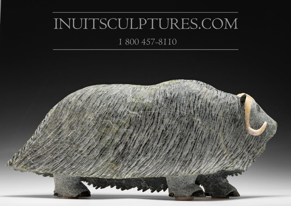 World Famous Lucassie Ikkidluak recently carved our gallery three of his iconic muskox. The least time he carved was over 3 years ago, and we do not expect him to carve for another 3. (His wife is deeply concerned about his lungs and the stone dust that he takes in). She does not allow him to carve much anymore.