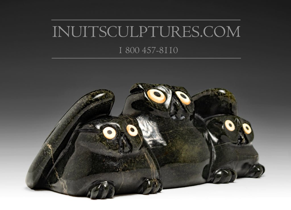 The inlayed eyes are Manning's raison d'etre and contribution to the Inuit art world. There is no artist that has mastered this gruelling technique quite like Manning. Fitting them into the stone takes much experience and skill. It is the eye catching colors of the eyes that bring his pieces to life.