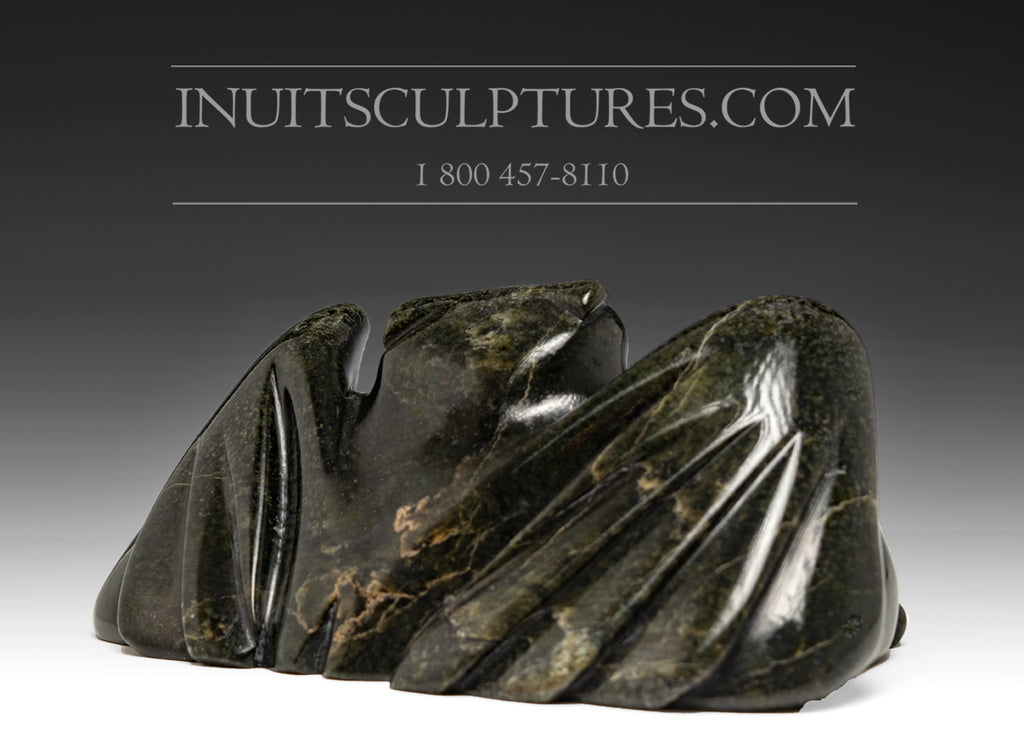 The eyes made from caribou antler blend exquisitely with the dark serpentine stone. The carving is polished to a mirror shine with beautiful proportions and lines throughout.