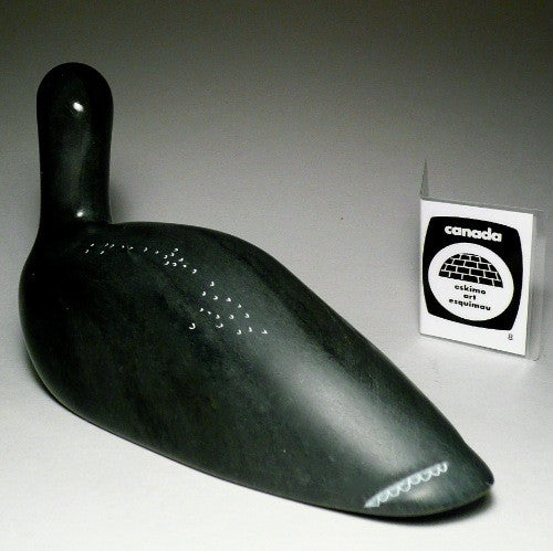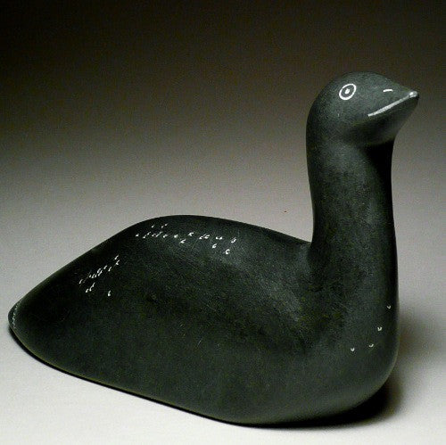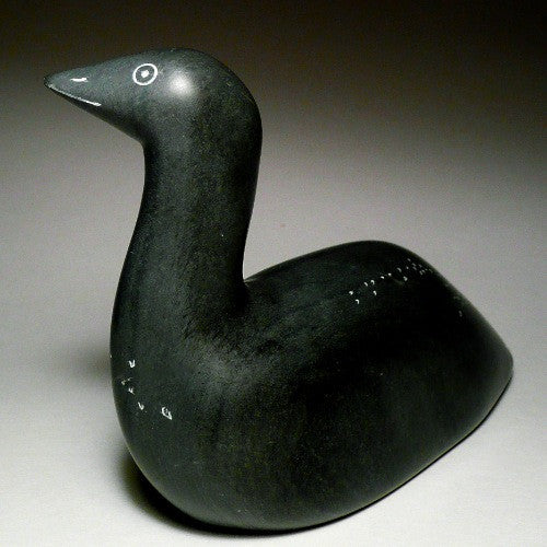 This is a wonderfully carved dark green Loon made from Sanikiluaq. What attracted me to this piece is the fact that is sends a positive vibe to its surroundings. It is a happy loon as is shown with the eyes. It gives me a happy feeling when I look at this loon, which in my opinion is a wonderful feature for a piece of art to have.