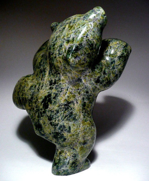 What strikes me the most about this gorgeous bear are the voluptuous curves. The roundness of the carving instantly puts me in a good mood when I look at it. Markoosie Papigatok is also very talented artist and specializes in dancing bears. His style for dancing bears is to accentuate the curves and to use beautiful colorations with the stone. This is what attracts Inuit art enthusiasts to his works. This dancing bear is perfectly balanced, large and impressive. It measures 8" tall, 7" wide.