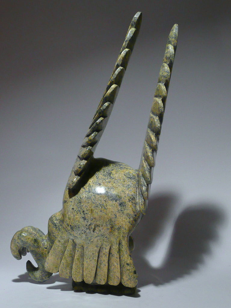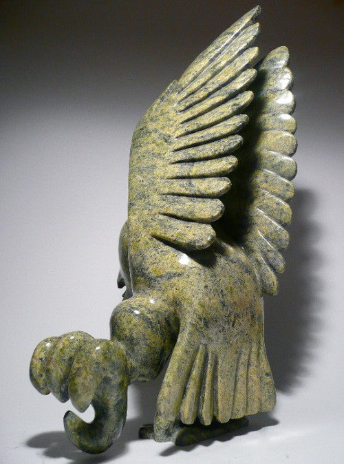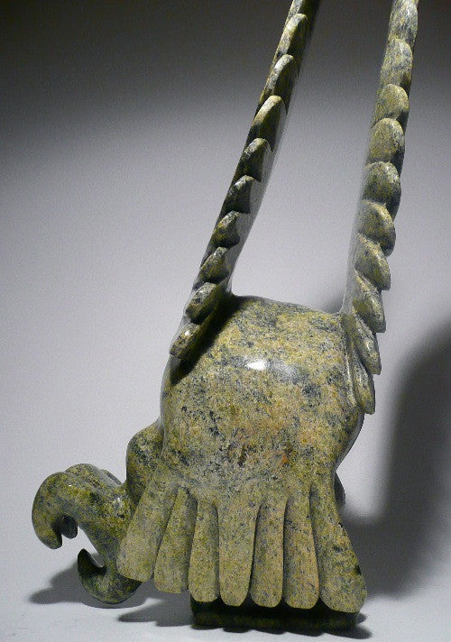 The main feature of this bird is that it is balancing on one leg with its wings in the upward position getting ready to take flight. It is full of movement and grace. Like all of Toonoo's pieces, this one too has a dramatic feel to it. The coloration of the stone is outstanding and done in a beautiful green.