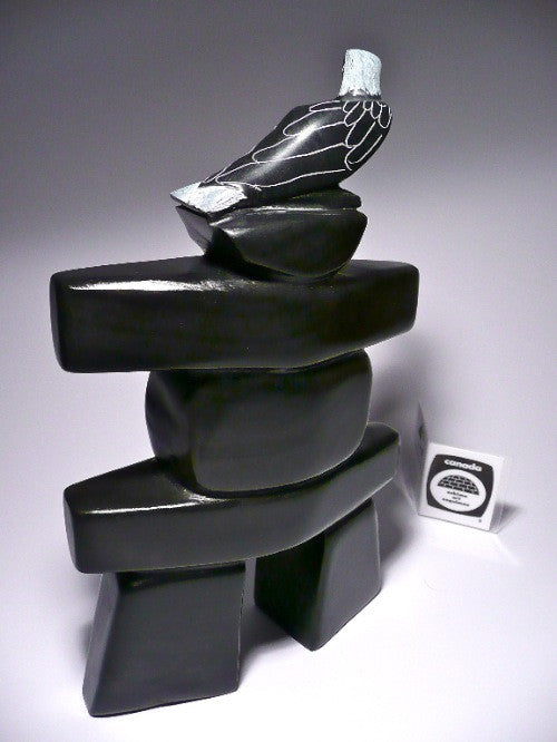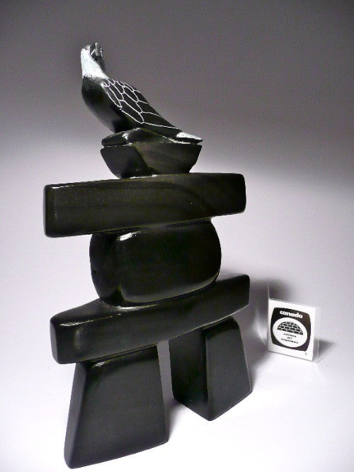This is a beautiful eagle on an Inukshuk by Josie Ohaytook. It is made with a dramatic dark argillite stone. The bald eagle has beautiful striking etch marks to show off its head and feathers. This detail gives depth and excitement to the carving as the white head and feathers contrast beautifully against the dark argillite stone of the Inukshuk.
