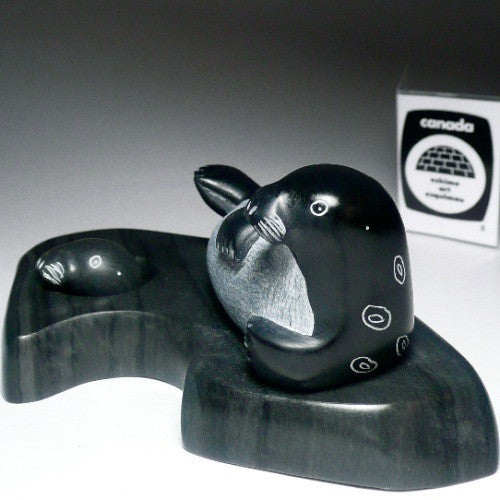 What caught my eye with this piece is the jet black stone used. I also particularly like the heads of the two seals as well as the etching mark spots on the back. Josie Iqaluq's is well known for his playful fun loving seals. They make wonderful gifts for weddings or anniversaries as they convey peace and harmony. It is very symmetrical and round with a gorgeous smooth finish to it. A property amongst Sanikiluaq art which makes it so famous.