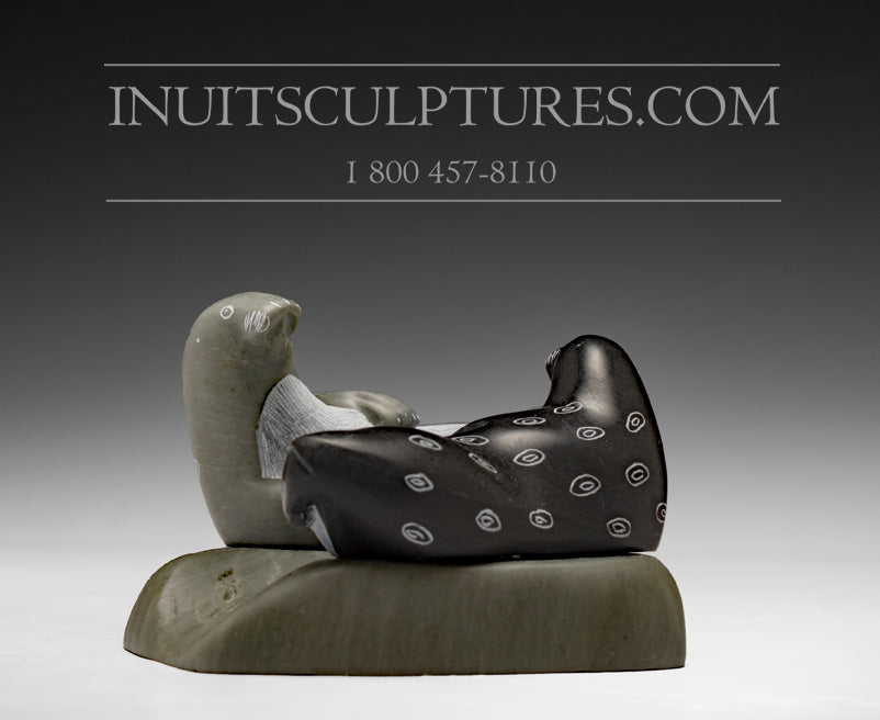 What caught my eye is the jet black coloration used for the stone. I also particularly like the heads of the two seals as well as the etching mark spots on the back. Josie Iqaluq is well known for his playful fun loving seals. They make wonderful gifts for weddings or anniversaries as they convey peace and harmony. It is very symmetrical and round with a gorgeous smooth finish to it. A property among Sanikiluaq art which makes it so famous.