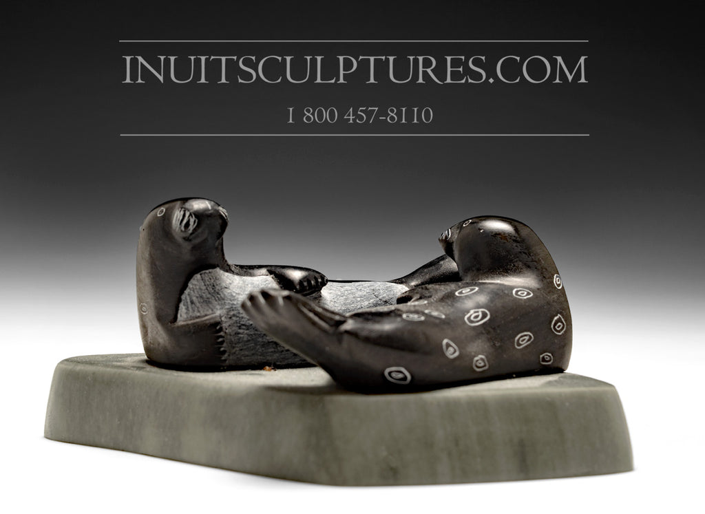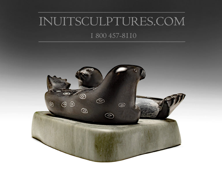 What caught my eye is the jet black coloration used for the stone. I also particularly like the heads of the two seals as well as the etching mark spots on the back. Josie Iqaluq is well known for his playful fun loving seals. They make wonderful gifts for weddings or anniversaries as they convey peace and harmony. It is very symmetrical and round with a gorgeous smooth finish to it. A property among Sanikiluaq art which makes it so famous.